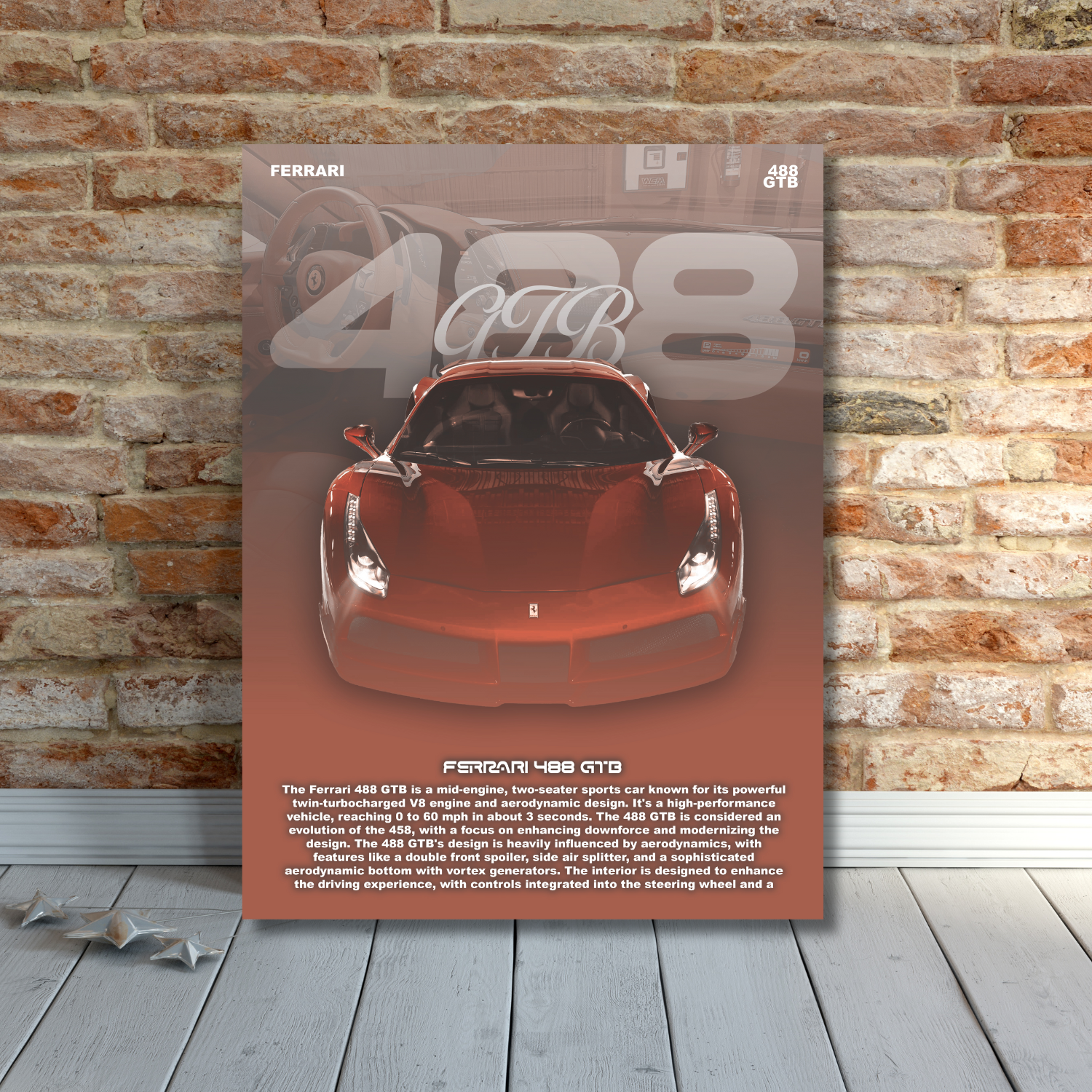 Esalta la tua passione per la velocità con questo poster della Ferrari 488 GTB, stampato su una lastra in alluminio di alta qualità da 30x40 cm. La finitura metallica esalta i dettagli e i colori vividi della celebre vettura rossa, trasformando ogni ambiente in un omaggio all’eleganza e alla potenza del mito Ferrari. Perfetto per gli appassionati che vogliono portare un tocco di esclusività e dinamismo nella propria casa o ufficio.