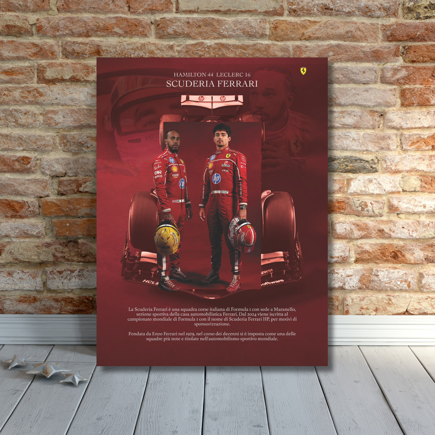 Immergiti nell’emozione della Formula 1 con questo poster esclusivo della Scuderia Ferrari, che celebra i campioni Leclerc e Hamilton. Stampato su una lastra in alluminio di alta qualità da 30x40 cm, questo pezzo unisce resistenza e stile, perfetto per ogni appassionato. Aggiungi un tocco di velocità e prestigio alle tue pareti con un’immagine che cattura la passione e la potenza della Ferrari in pista.
